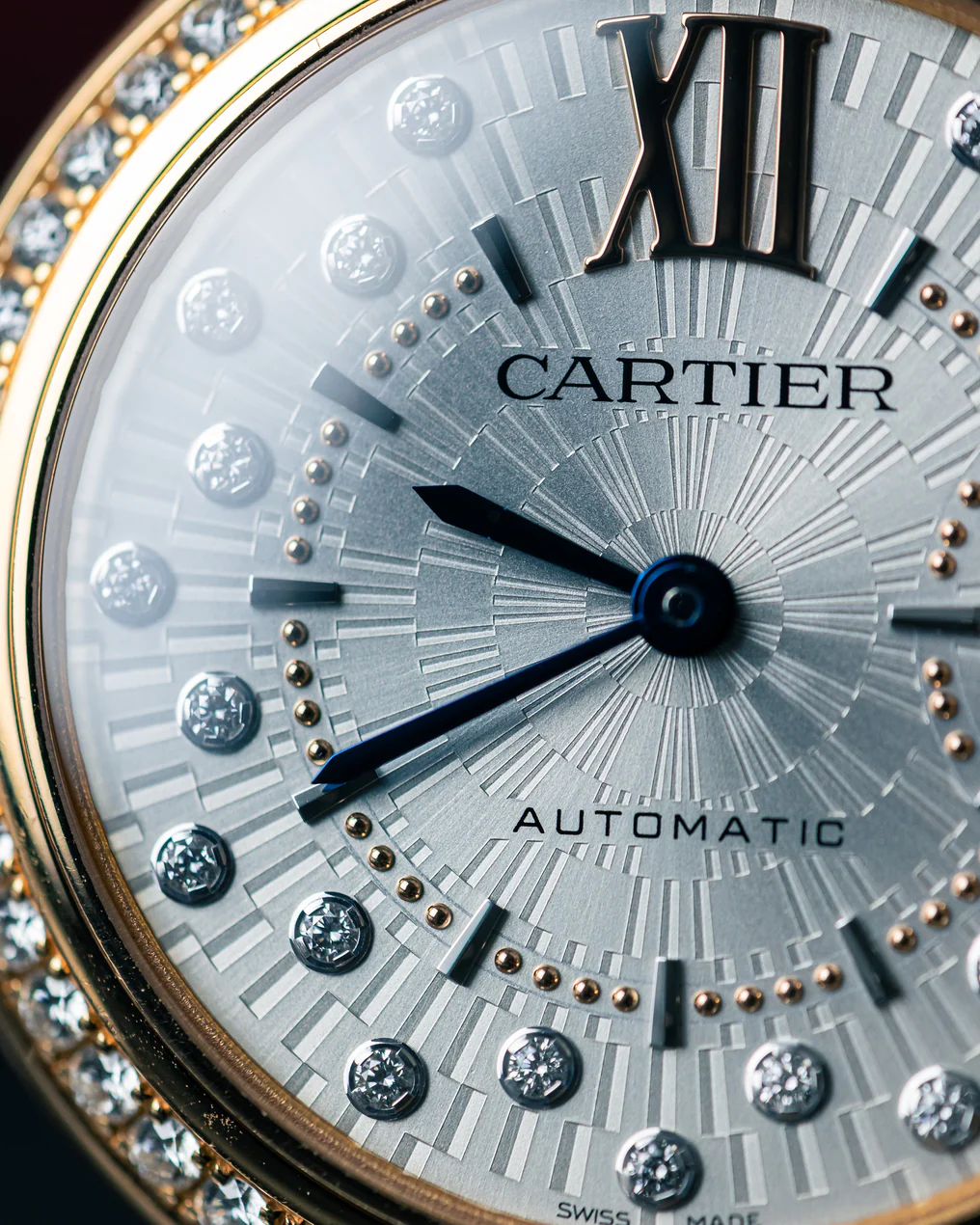 An elegant timepiece with its signature fluted crown decorated with a blue cabochon sapphire like a floating balloon, the rose gold case is set with 47 diamonds and an addition 21 diamonds on the silvery guilloché dial, completing the unique design. The blue sword shaped hands ads contrast while the deep burgundy alligator strap completes the elegant and sophisticated look.