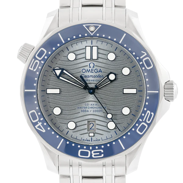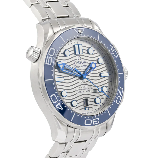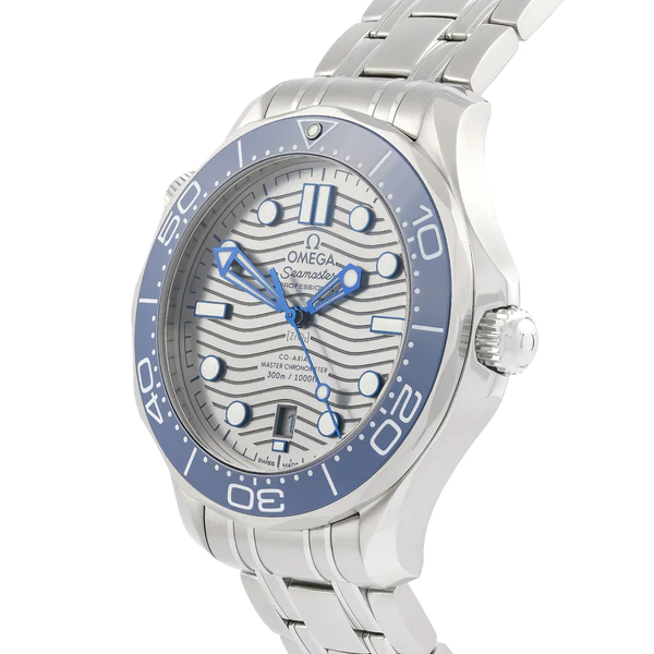 A pre-owned Omega Seamaster ref. 210.30.42.20.06.001. This watch features a 42mm stainless steel case with a silver dial and a blue ceramic bezel. It is fitted with an adjustable stainless steel bracelet, a foldover clasp and a diver extension.