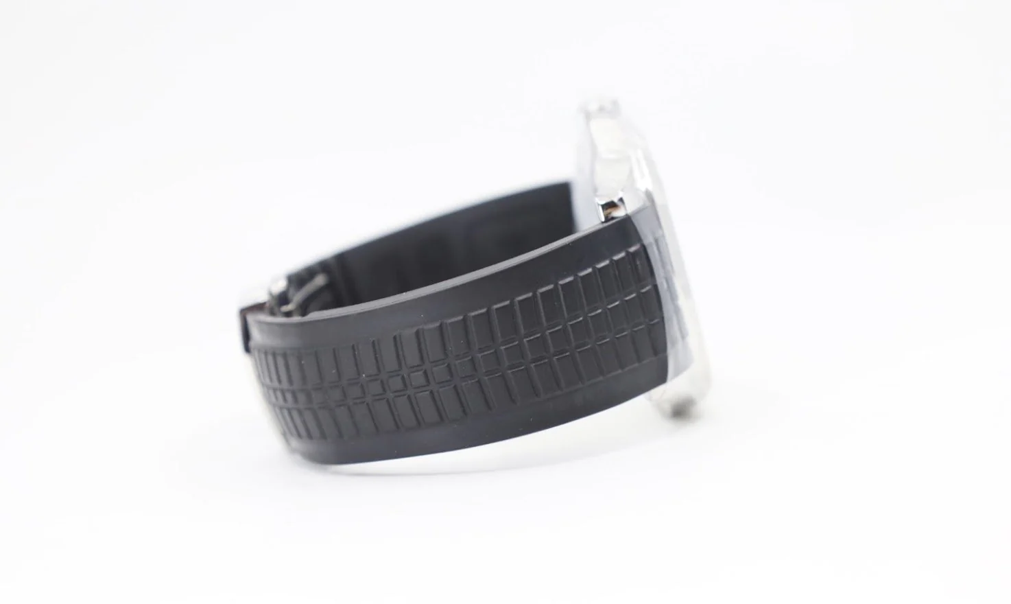 40mm stainless steel case, sapphire crystal back, embossed black dial, self winding caliber 324 S C movement with date, approximately 45 hour of power reserve, Tropical composite black strap with fold-over buckle. Water resistant to 120 meters.
